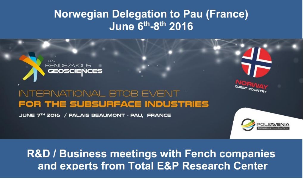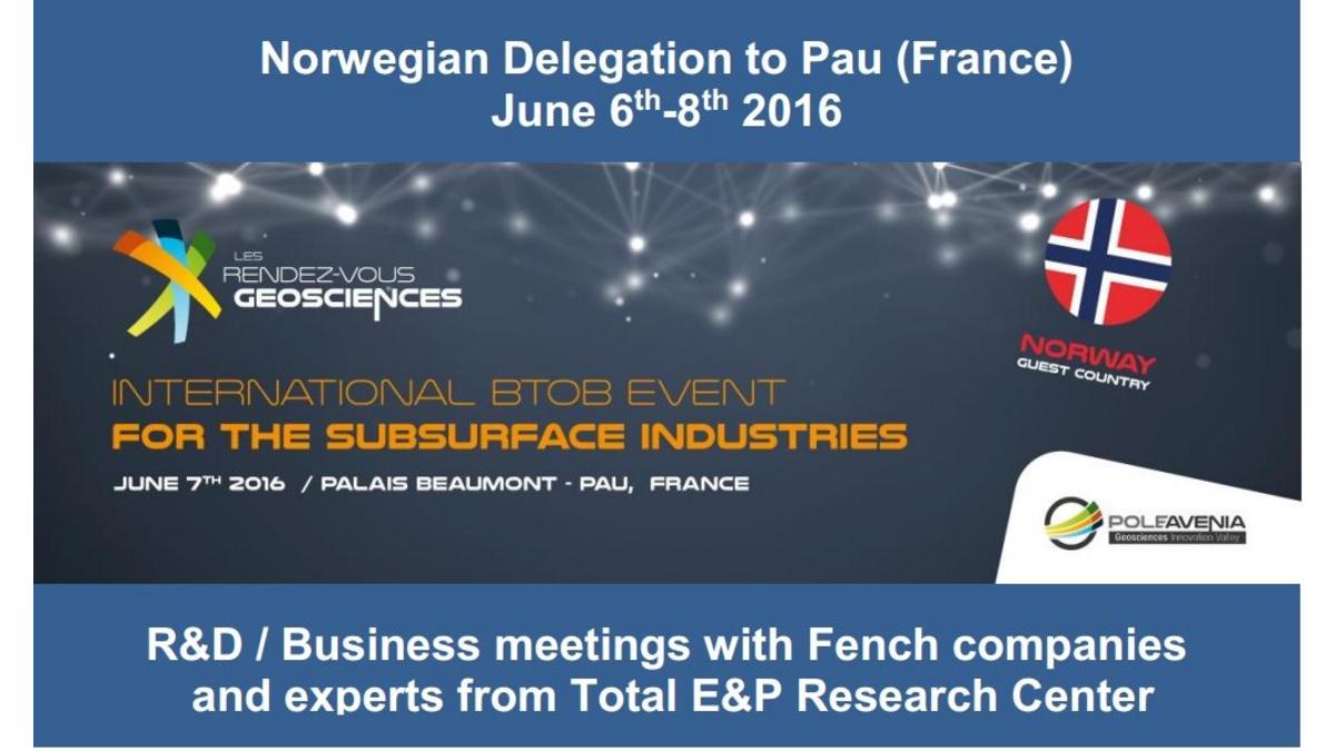 « Rendez-vous Geosciences » is an annual event organized by local cluster Pole Avenia and its partners. In 2016, Norway will be the only guest country, thus granting the Norwegian companies a privileged access to the local business and technological environment. The event gathered last year more than 150 participants, with more than 500 meetings among SMEs, majors, R&D, and over support organisations.