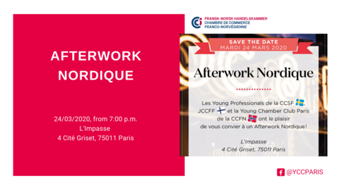 The Young Professionals of the Swedish Chamber of Commerce in France, the Young French-Finnish Chamber of Commerce and the CCFN's Young Chamber Club Paris invite you to a Nordic Afterwork organised at L'impasse on Tuesday, March 24th