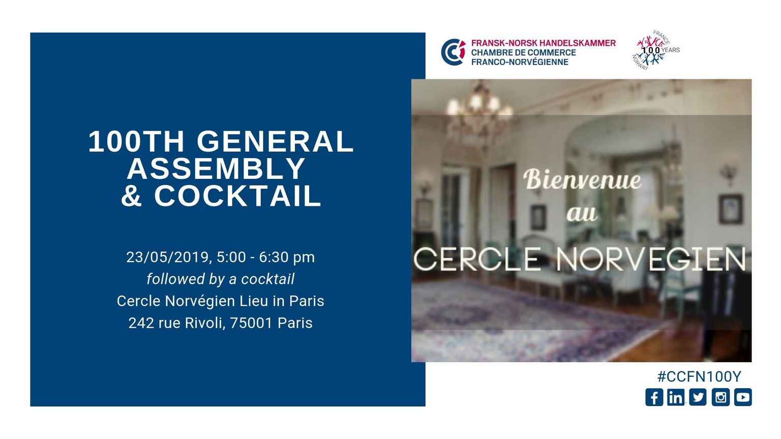We are pleased to invite our members to the 100th General Assembly of the French-Norwegian Chamber of Commerce which will be held Thursday 23rd of May 2019 from 17h00 to 18h30 at Den Norske Klubben i Paris (242 rue Rivoli, 75001 Paris) followed by a cocktail.