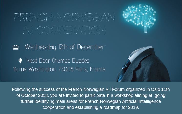Following the success of the French-Norwegian A.I Forum organized in Oslo the 11th of October 2018, you are invited to participate in a workshop aiming at going further identifying the main areas for French-Norwegian Artificial Intelligence cooperation and establishing a roadmap for 2019