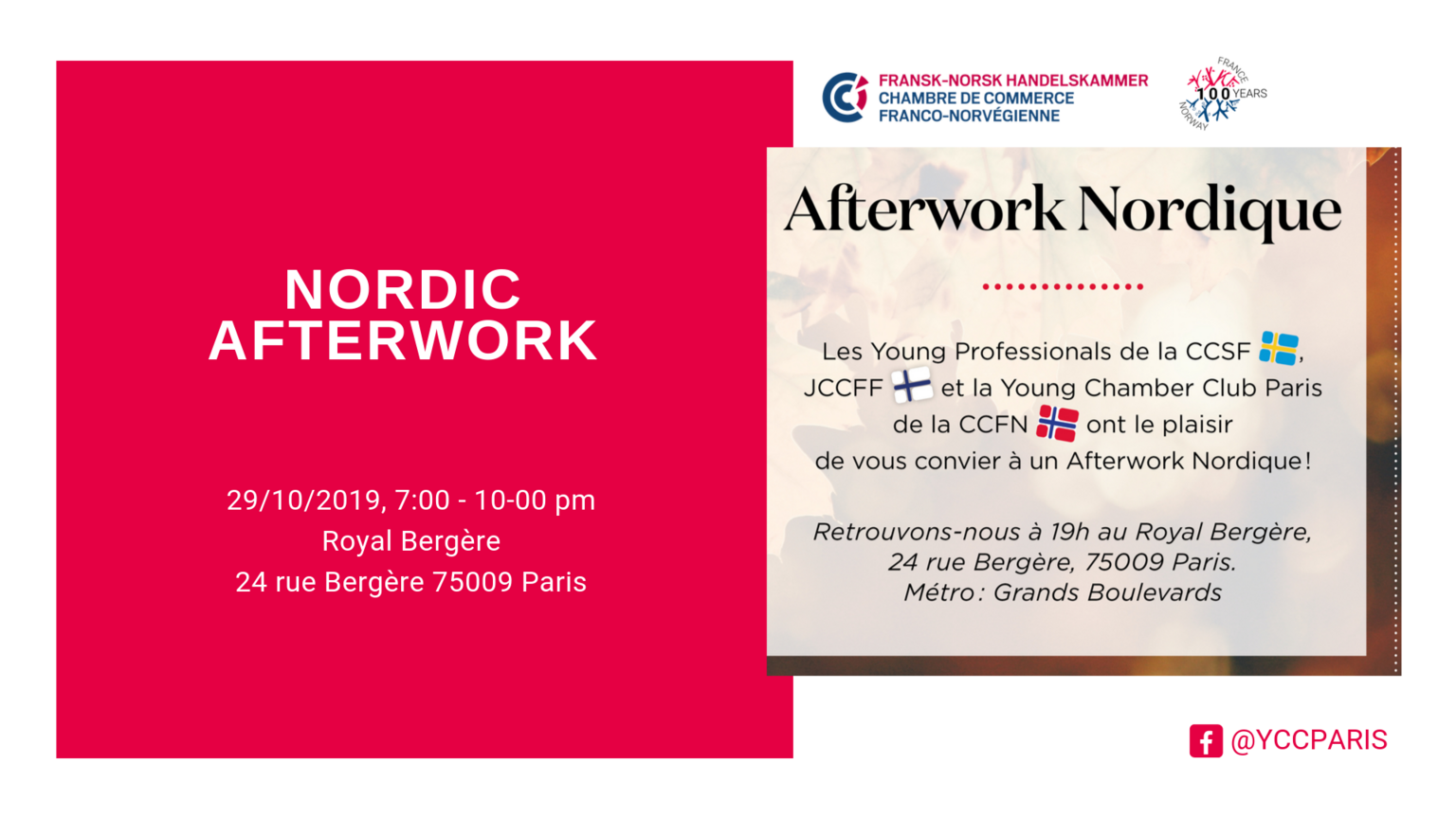 The Young Professionals of the French-Norwegian Chamber of Commerce, the Swedish Chamber of Commerce and the French-Finnish Chamber of Commerce invite you to participate in a Nordic Afterwork at Royal Bergère, Tuesday October 29th.