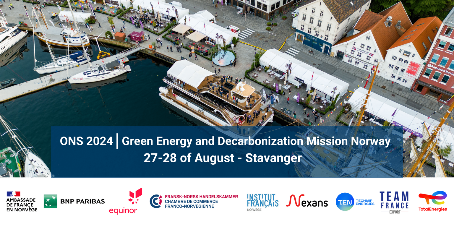 The French-Norwegian Chamber of Commerce (CCFN), representative of Team France Export in Norway organises the Green Energy and Decarbonisation Mission during ONS 2024. The event is organised in cooperation with Evolen and TotalEnergies.
