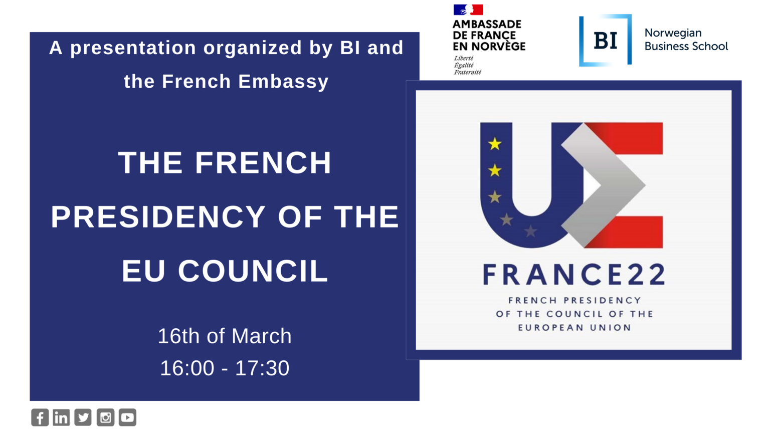The Ambassador’s presentation will focus on « The French Presidency of the Council of the European Union in H1 2022 : why is it also important for Norway?”