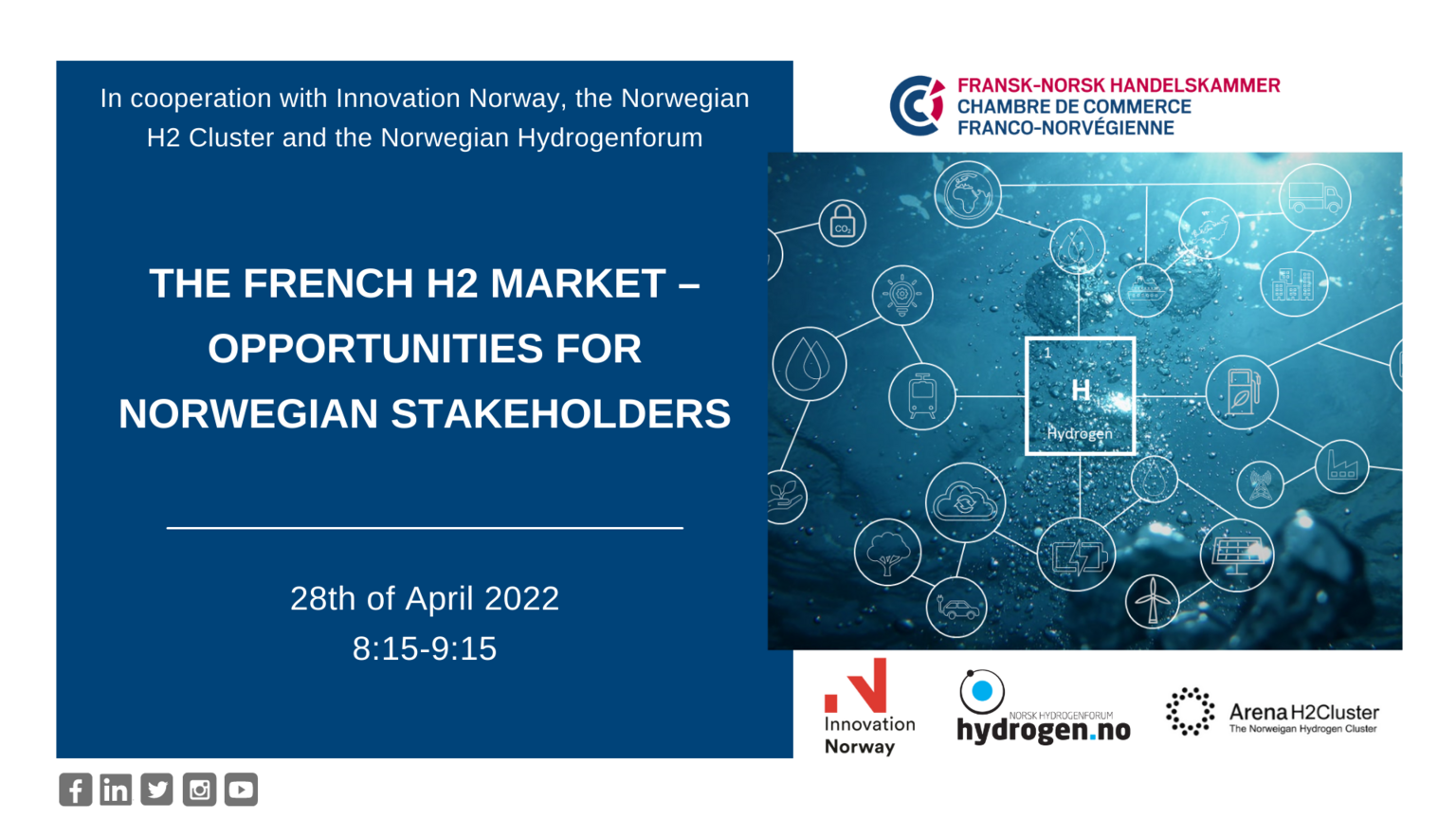This webinar, organized in cooperation with Innovation Norway, the Norwegian H2 Cluster and the Norwegian Hydrogenforum, will take place on April 28. Following the announcement of the ambitious French H2 strategy, we see strong cooperation opportunities on mobility and industry uses of H2. The webinar will be an opportunity to present the results of the hydrogen study on the French market conducted by the French-Norwegian Chamber of Commerce and Innovation Norway.