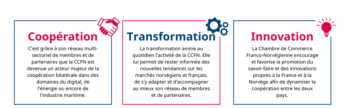 La CCFN se donne pour mission de promouvoir les liens économiques, commerciaux et industriels qui unissent la Norvège et la France, ainsi que la coopération bilatérale entre les deux pays. La CCFN est un acteur important de la communauté d'affaires franco-norvégienne depuis sa création en 1919. Notre objectif est de continuer à jouer un rôle-clé dans les relations commerciales franco-norvégiennes au cours des cent années à venir.
