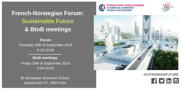 On the occasion of the celebration of its 100 years anniversary, the French-Norwegian Chamber of Commerce invites you to an inspirational bilateral forum on: " Building a sustainable future together".